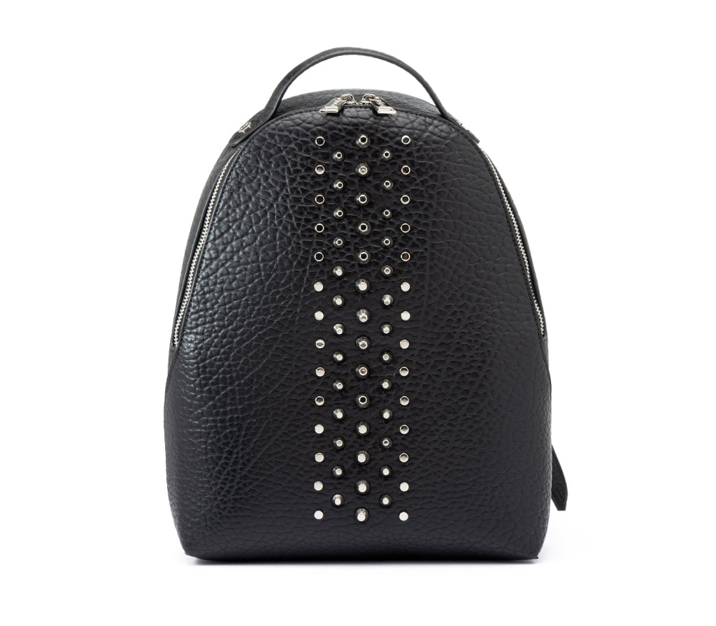 Backpack emblematic of urban glam-rock style. The textured surface combines with studded details on the front, creating a bold and contemporary look. The top handle and compact structure make it perfect for those who want to stand out with an accessory with a strong character.