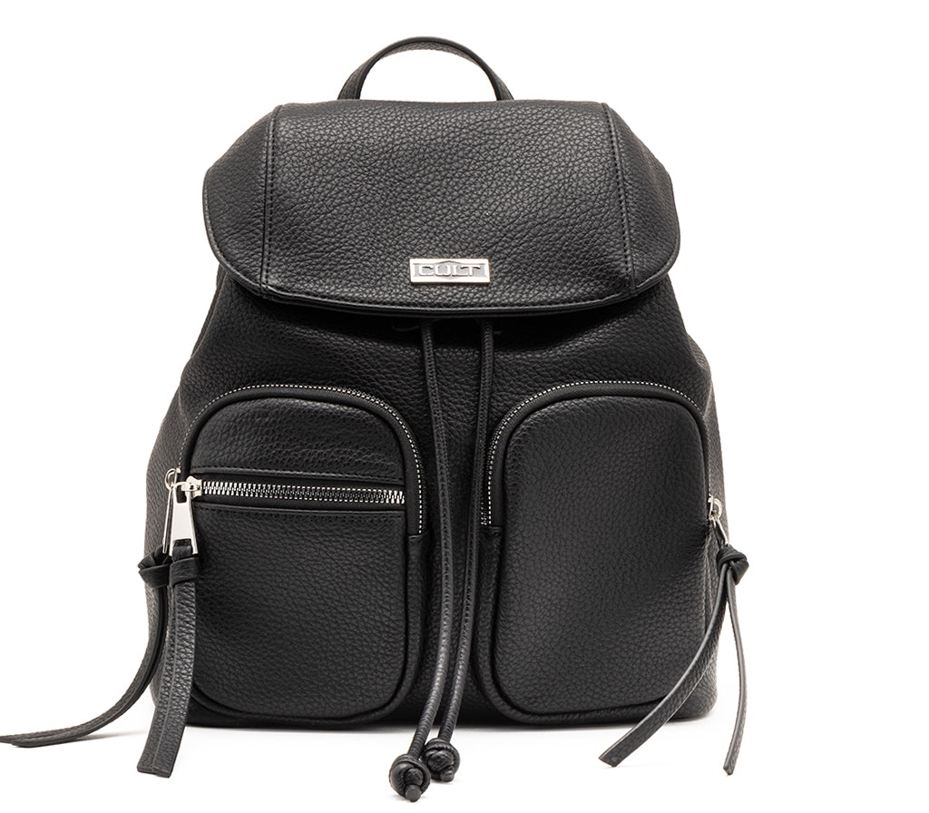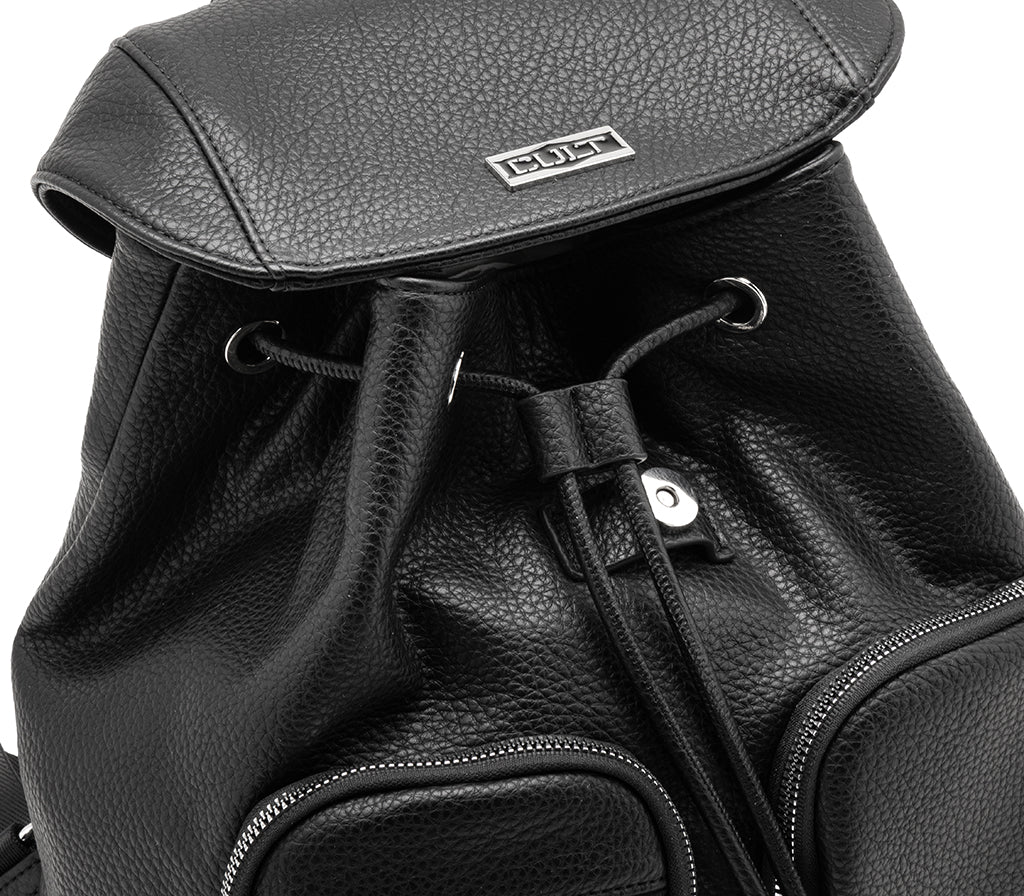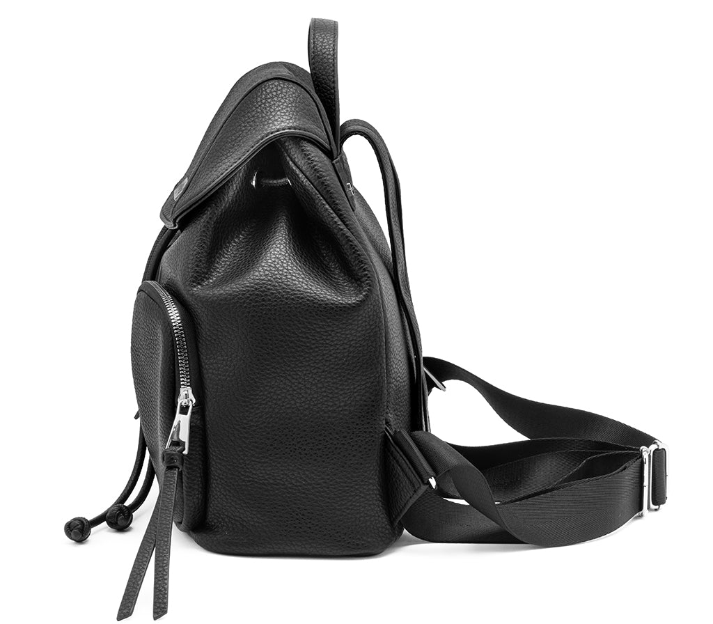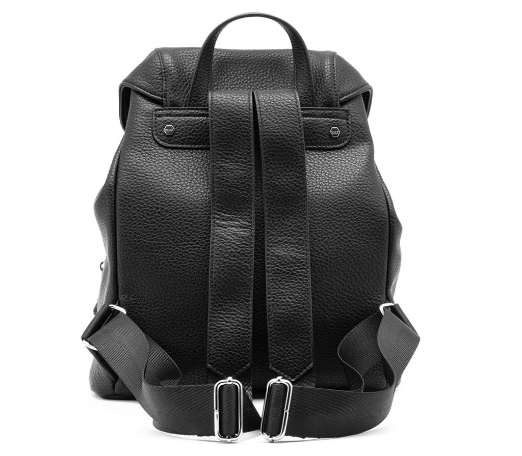 Eleganza rilassata e dettagli ricercati definiscono lo zaino Vega per la stagione SS26, un accessorio che interpreta il dinamismo urbano con un tocco glam-rock. Realizzato in ecopelle nera dalla grana naturale, si distingue per la raffinata lavorazione a punto sella lungo i profili della patta e per le doppie tasche frontali con lunghe nappe decorative. La chiusura con coulisse e la silhouette morbida lo rendono lo zaino perfetto per chi cerca un look sofisticato e funzionale, ideale per completare outfit daily dal carattere deciso. Dimensioni: 27x3313.